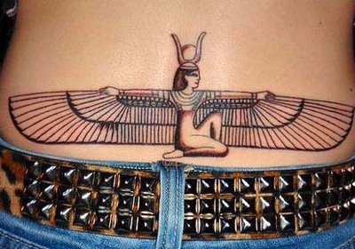 Other popular Egyptian god tattoos include, Hathor the Goddess of love, music, dance and is represented by cow horns and a sundisk on the head. Anubis is know as the god of embalming and is represented by the head of a jackal. Ma'at is known as the goddess of justice and is seen with an ostrich feather in her hair along with winged armed.